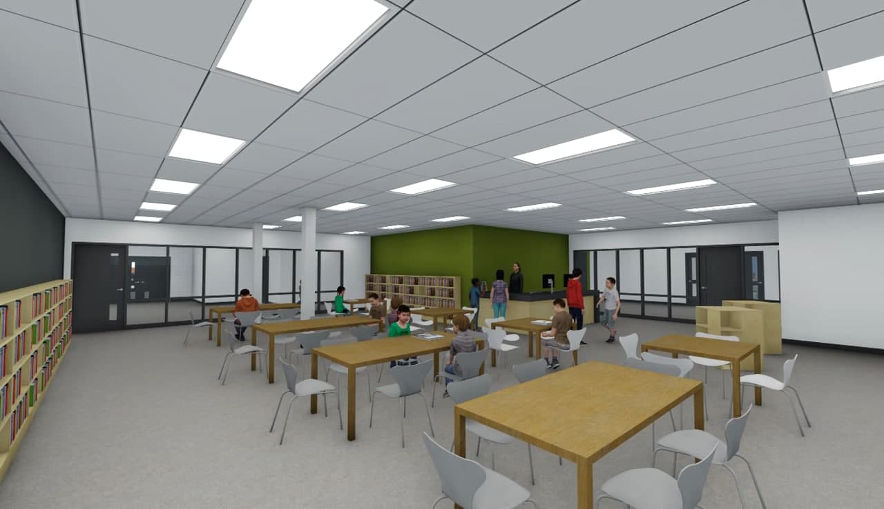 The library is located near the main entrance and vertical circulation points and is centrally positioned to allow ease of access for staff and students from both the first and second floors. The daycare is located at the south-east corner of the school and has a secured main entrance from the daycare parking area located to the south of the school. The daycare will be secured from the remaining school and has its own separate access to its own outdoor daycare play area.